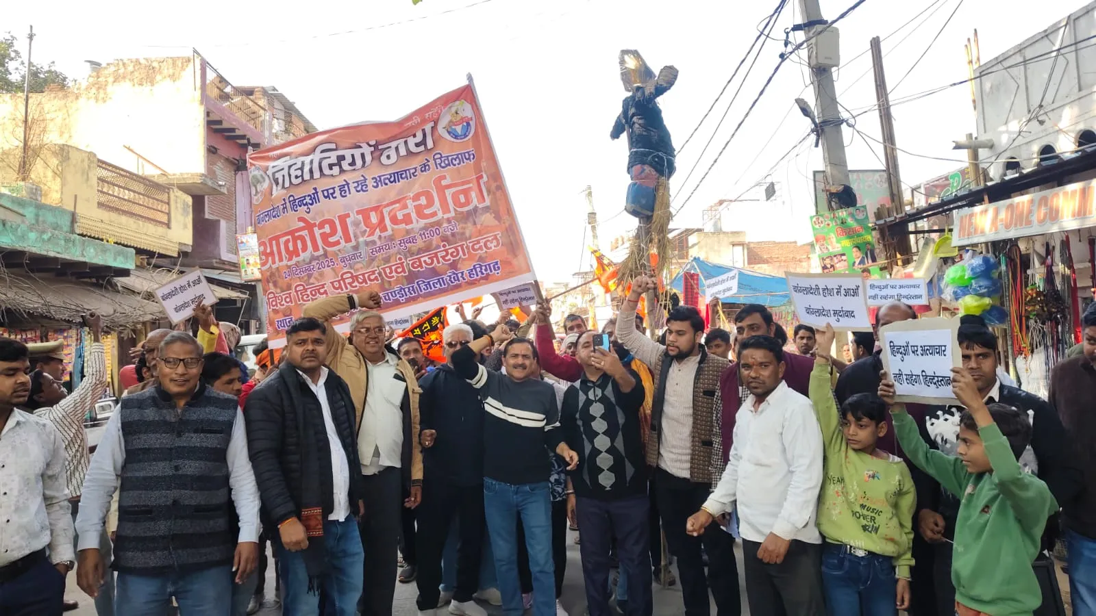 बांग्लादेश में हिंदू समुदाय पर हो रहे कथित अत्याचारों के विरोध में अलीगढ़ जिले के नगर पंचायत चंडौस में विश्व हिंदू परिषद और बजरंग दल के कार्यकर्ताओं ने जोरदार प्रदर्शन किया।